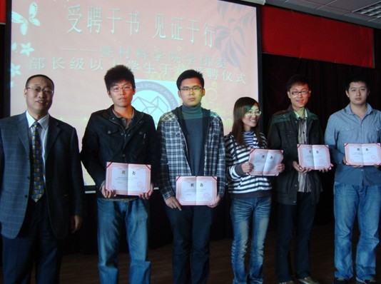 全体学团委成员以及大一的班干部齐聚南岭逸夫机械材料馆,参加了“受聘于书,见证于行”学团委部长级以上学生干部受聘仪式。党委副书记兼副院长唐立山老师,辅导员辛颖、柴媛老师参加了本次受聘仪式。