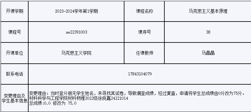公示日期: 2024年_3月_18日至2024年_3月_22日如有异议请于公示期内向教务处教学运行科反映。联系人: 邹老师 联系电话: 0431-85168962相关材料详见附件:1.18禁 考核成绩复查、修改登记表2.18禁 情况说明(18禁 教学委员会讨论通过、签字盖章)3.试卷等相关佐证材料
